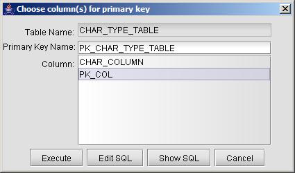 You will see a dialog displaying all of the columns from the selected table that are available for use in the new primary key. You may also change the name of the constraint that is used to enforce the primary key by changing the "Primary Key Name", which by default is set to PK_<Table Name>.