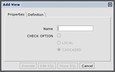 In the "Properties" tab you have to set the name of the view. If the database supports CHECK options you can enable them and choose between LOCAL and CASCADE.