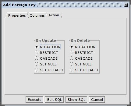 At last you can choose the ON UPDATE and ON DELETE actions in the "Action" tab. By default "On Update" and "On Delete" are set to NO ACTION.