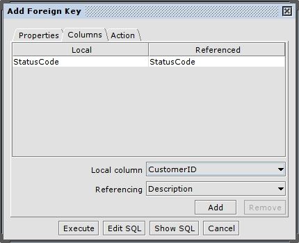 Next you have to choose the columns of this foreign key in the "Columns" tab. You can add related columns by selecting one from the selected table and one from the referenced table and click the "Add" button. To remove a pair of columns select the corresponding row and click on the "Remove" button.