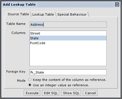 If you've selected the second mode there is an additional "Special Behaviour" tab. In this tab you can specify behaviour of this refactoring. This becomes nessesary because mode 2 may drop the source column to replace it with an integer column to reference the new lookup table. Because the source column could be used by other database objects like views, you have to decide if you want to drop the column cascaded. (Default: column is dropped NOT cascaded)