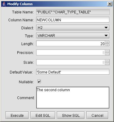 The add column dialog allows you to specify the definition of the new column to be added to the selected table. The "Dialect" drop-down list allows you to see the effect on the SQL when using a different dialect (the SQL generated will be according to the dialect chosen - the dialect of the connected database is selected by default) The type of the column can be chosen from the type list (the types are standard JDBC types which get mapped to vendor-specific types by the dialect specified in the dialect list). The other fields represent allowable attributes of columns in most databases and should be self-explanatory. One thing to note regarding types and length / precision and scale - precision and scale only apply to number types, such as NUMERIC, DECIMAL, FLOAT, etc. The length attribute only applies to character and byte types such as VARCHAR, CHAR, BINARY, etc. In most databases when using BLOB and CLOB types, these attributes are ignored since large objects have length that is variable and high-capacity (2GB).
