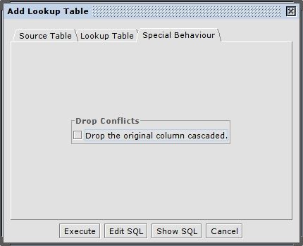 If you've selected the second mode there is an additional "Special Behaviour" tab. In this tab you can specify behaviour of this refactoring. This becomes nessesary because mode 2 may drop the source column to replace it with an integer column to reference the new lookup table. Because the source column could be used by other database objects like views, you have to decide if you want to drop the column cascaded. (Default: column is dropped NOT cascaded)